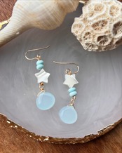 星型のマザーオブパール(白蝶貝)とマグマイトターコイズ、ブルージェードを合わせた爽やかなピアスです。