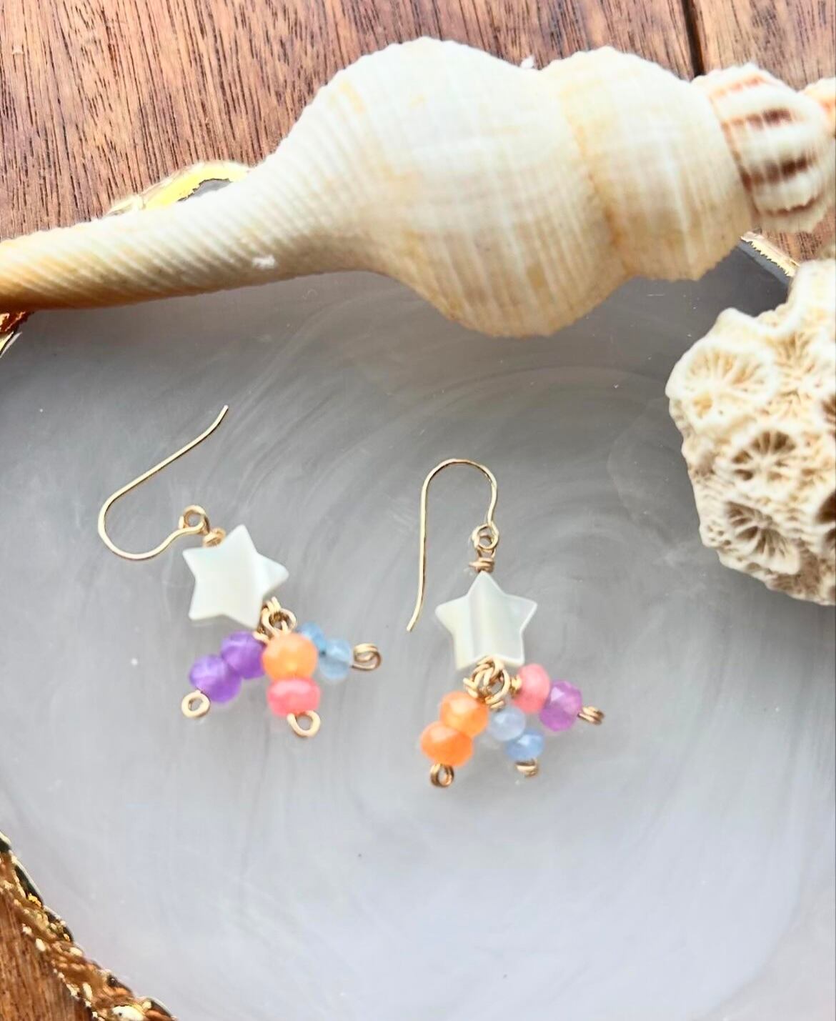 星型のマザーオブパール(白蝶貝)とカラフルなジェードを合わせました。