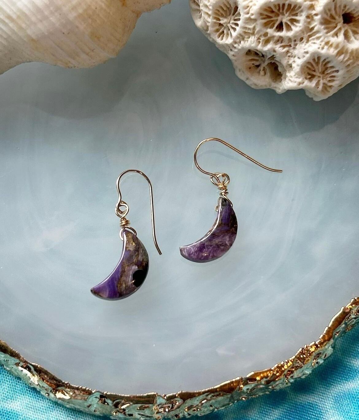 神秘の紫と金のきらめきを宿すチャロアイト×銅のブレンド天然石を、三日月のかたちに仕立てたピアスです。