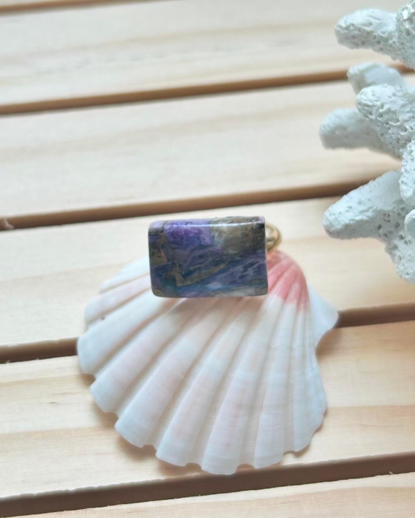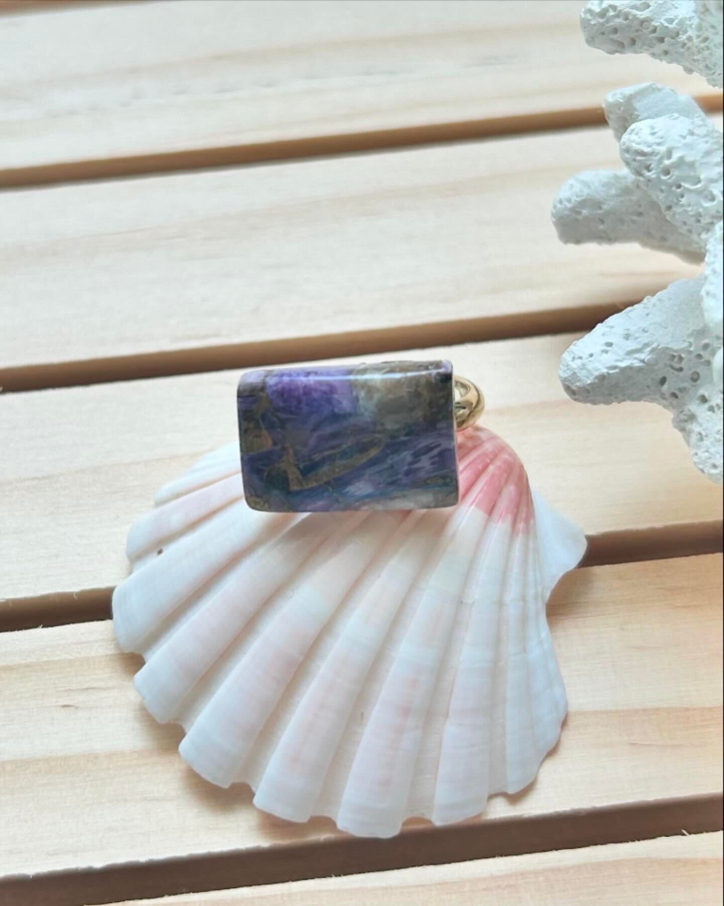 深く神秘的な紫色のチャロアイトと温かな銅の輝きが融合したブレンド天然石を使用したリングです。