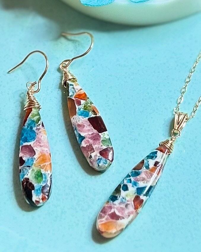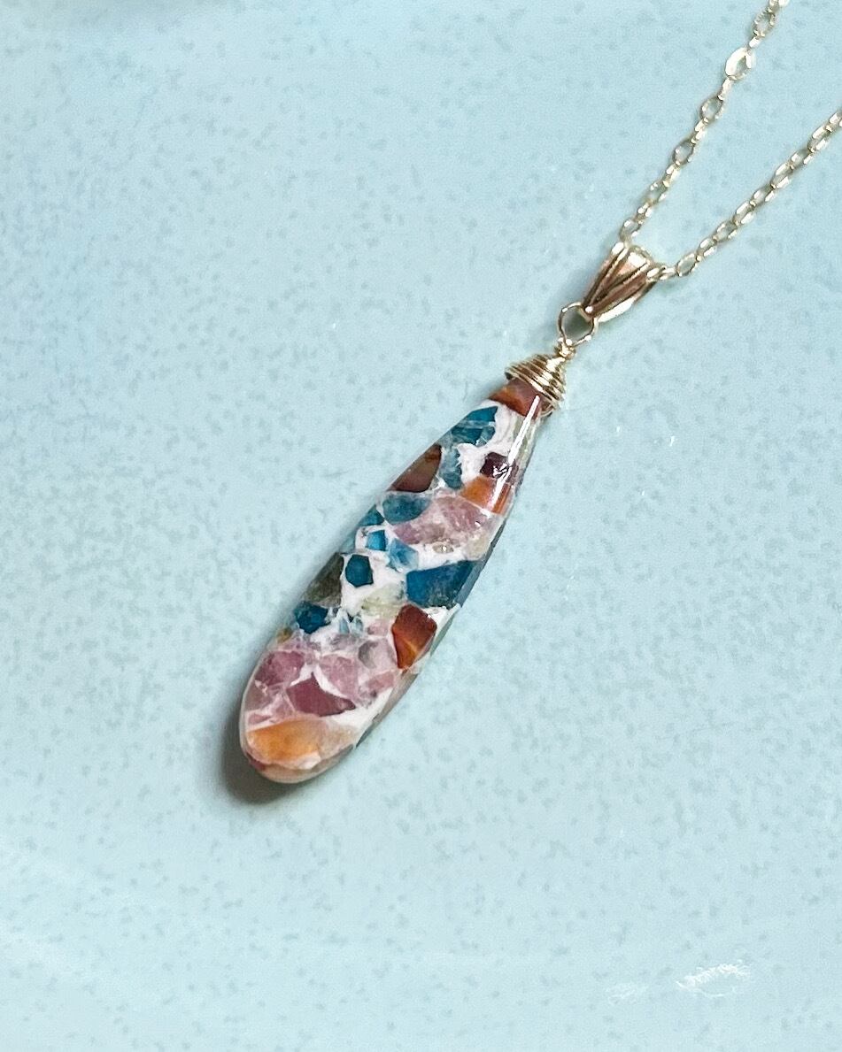 天然石、ペンダントトップ、14kgf、カレイドアース、ロングペアシェイプ、カラフル、一点もの、オパール、カーネリアン、アパタイト、ガーネット、トルマリン、宇宙モチーフ、万華鏡、地球のかけら、ハンドメイドアクセサリー、プレゼント、星のしずく、幻想的、物語アクセサリー