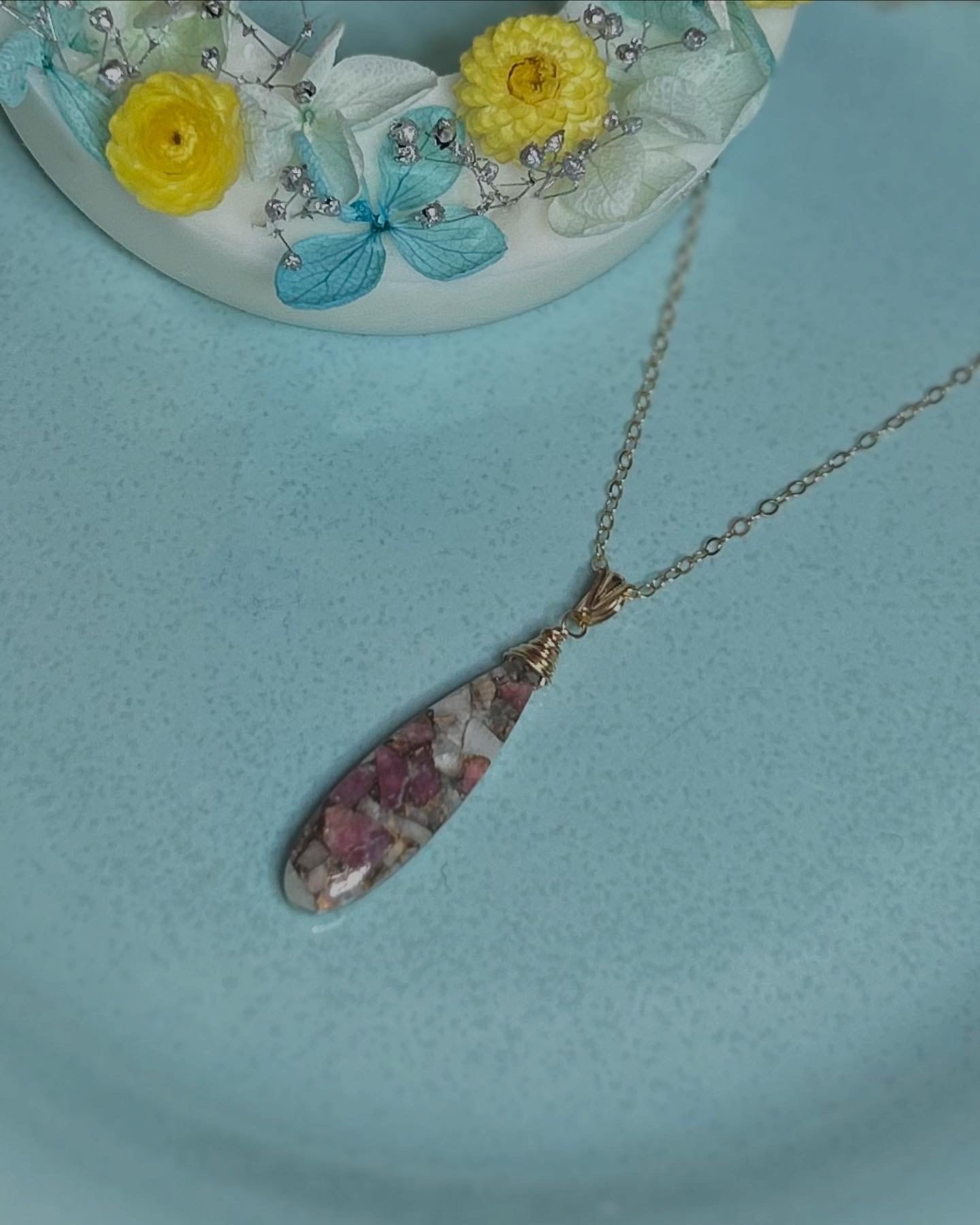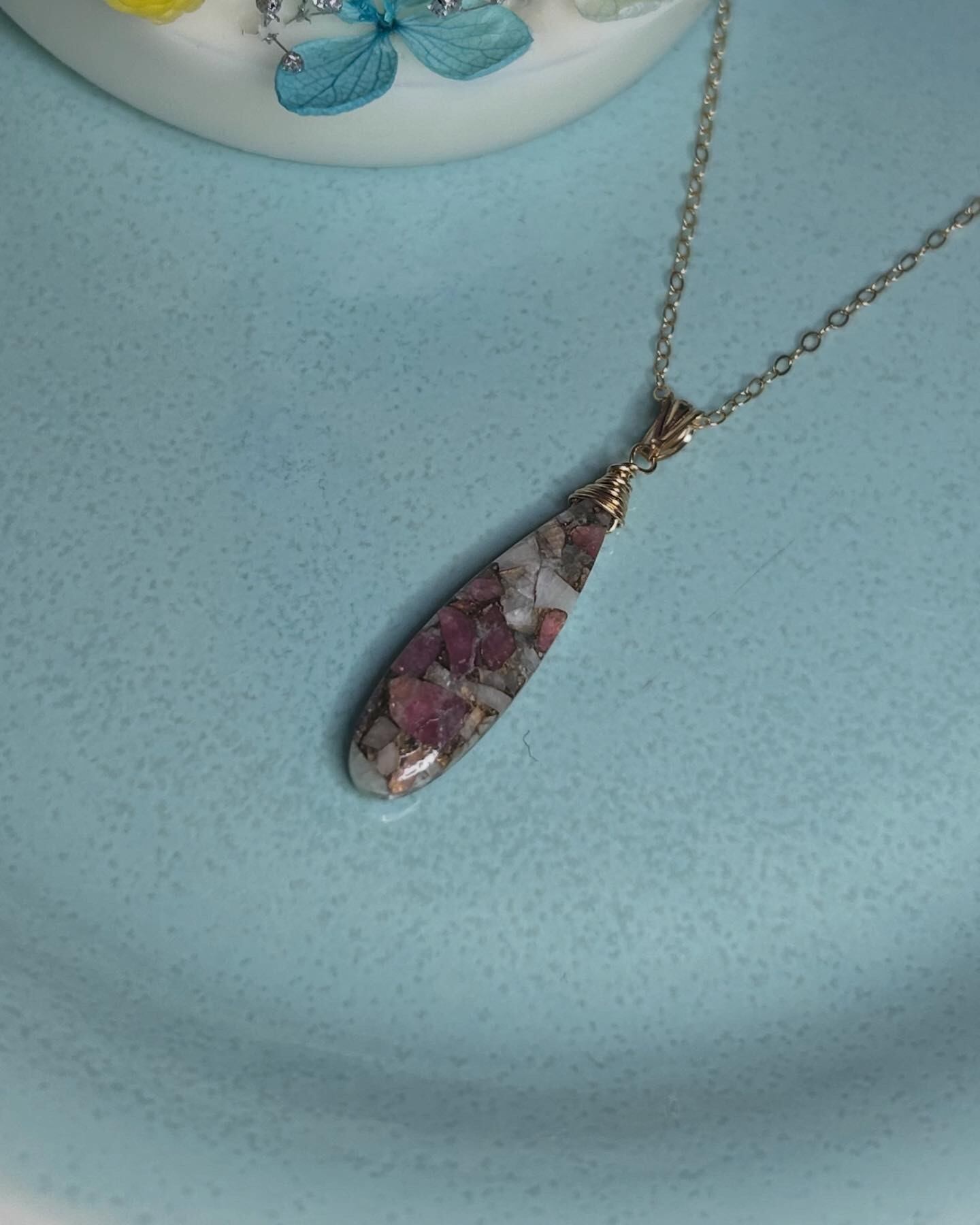 ピンクトルマリンカルサイトコッパー ロングペアシェイプ ペンダントヘッド