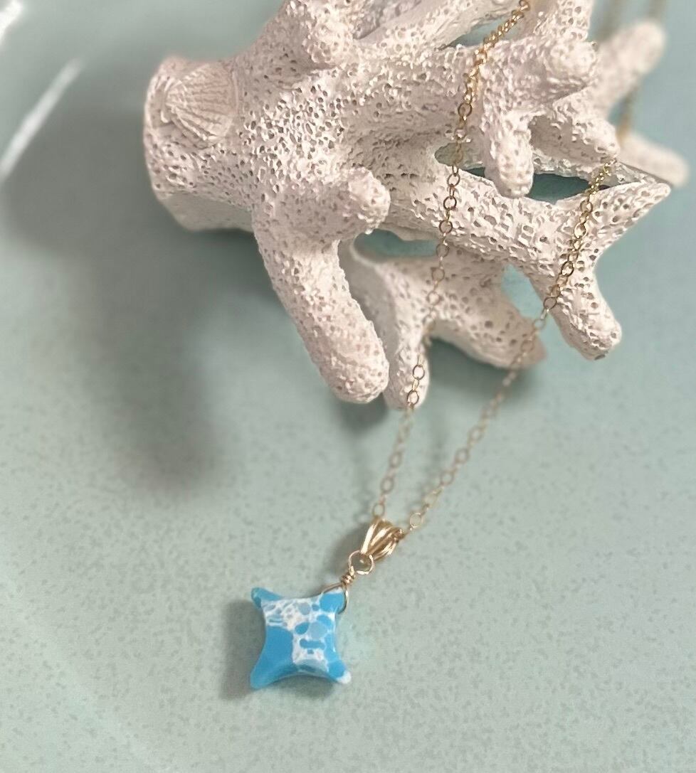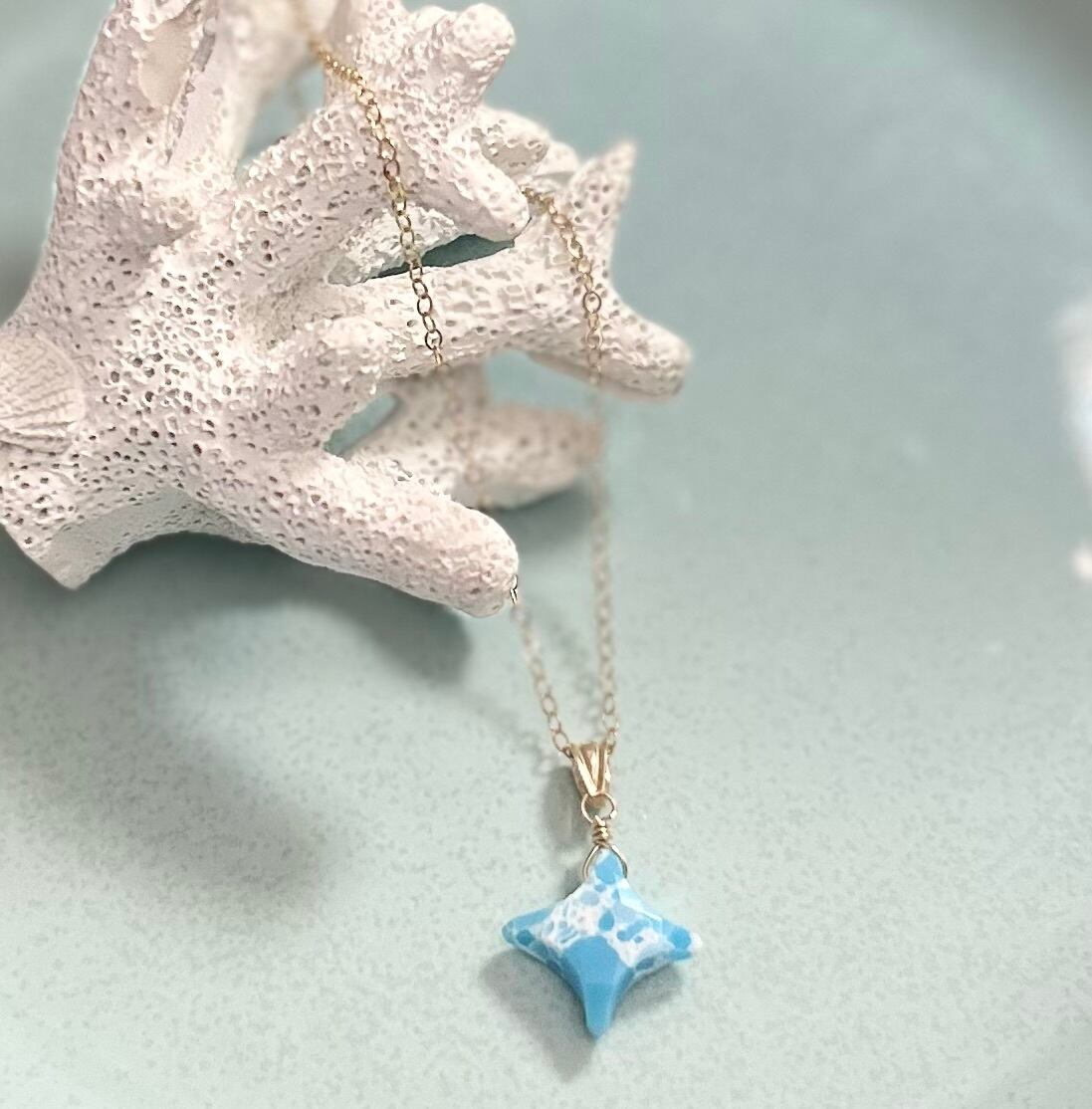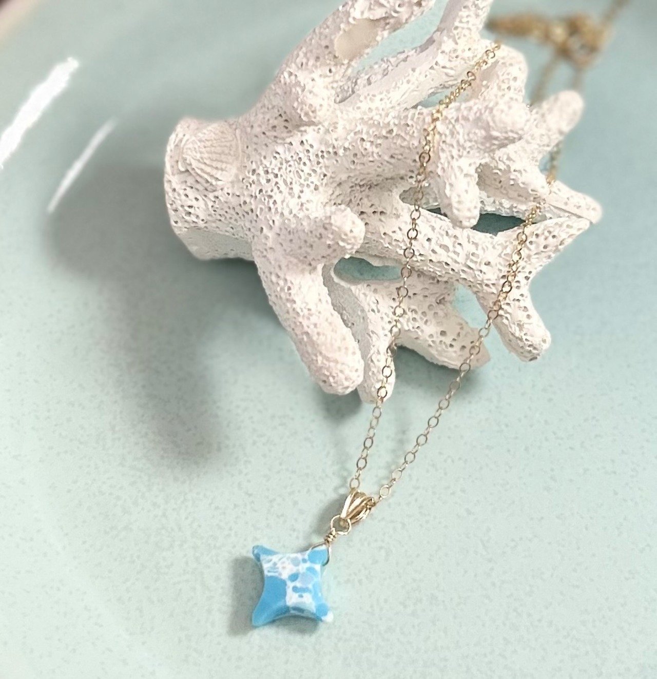 爽やかな青色と立体的な形状が特徴で、空や海を思わせる神秘的な印象を与えます。