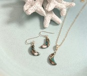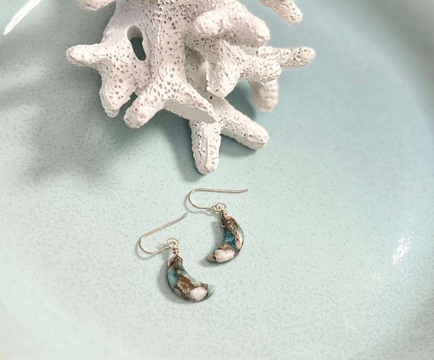 美しいアマゾナイトとカルサイト、コッパーを組み合わせた魅力的な月型ピアスです。