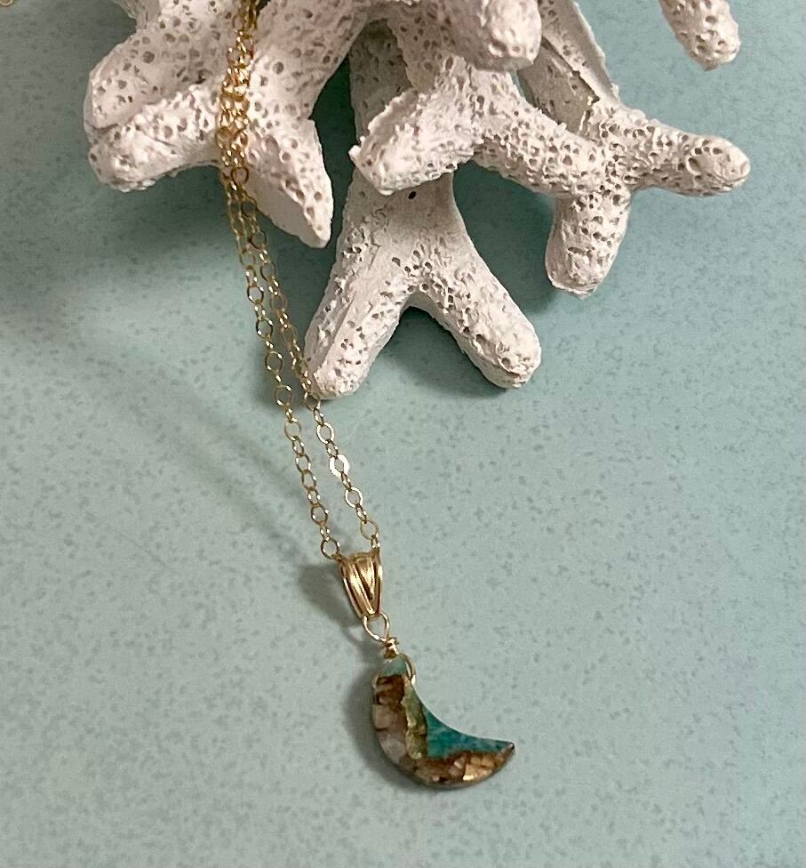 神秘的なアマゾナイトと輝くカルサイト、そしてコッパーを組み合わせた美しい月型のペンダントヘッドです。