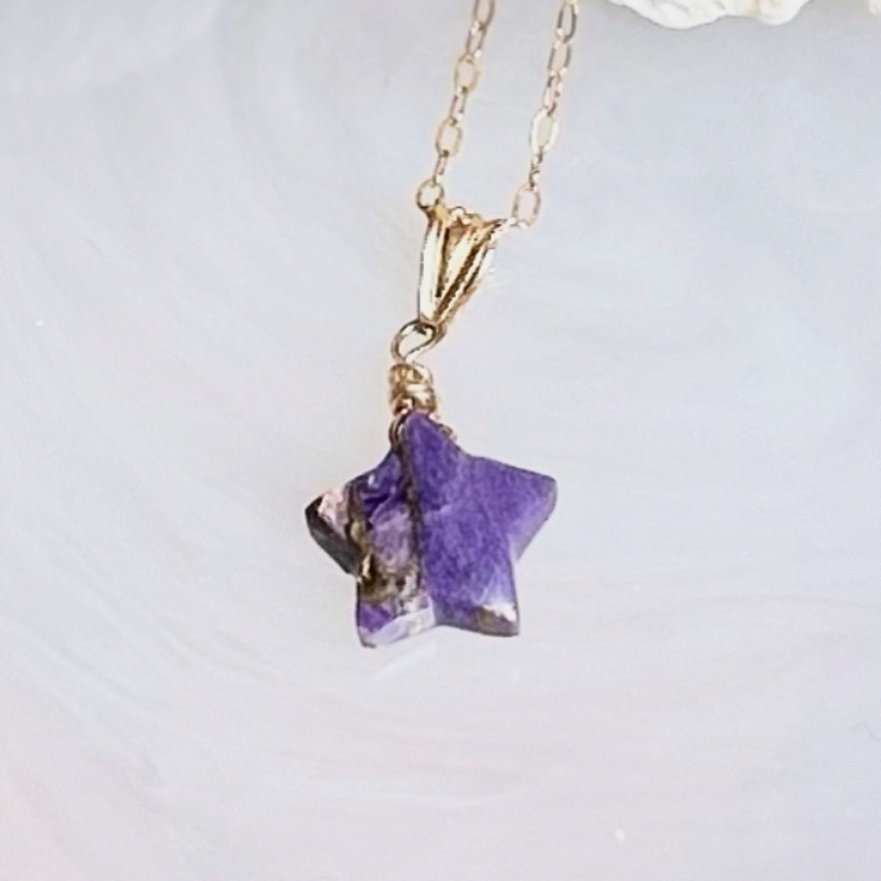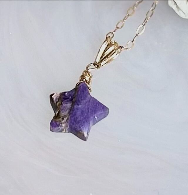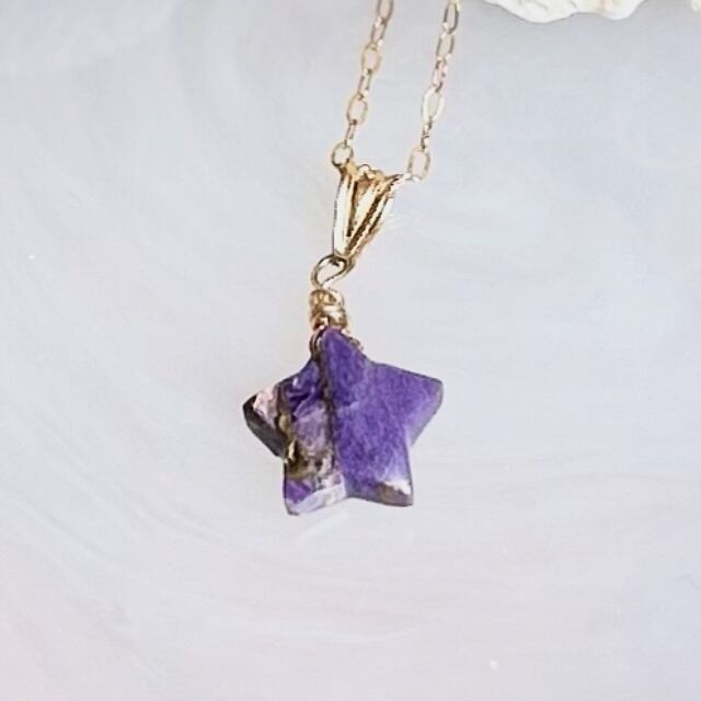 神秘の紫と金の煌めきが美しく調和するチャロアイト×銅のブレンド天然石を、星型にカットしたペンダントトップです。