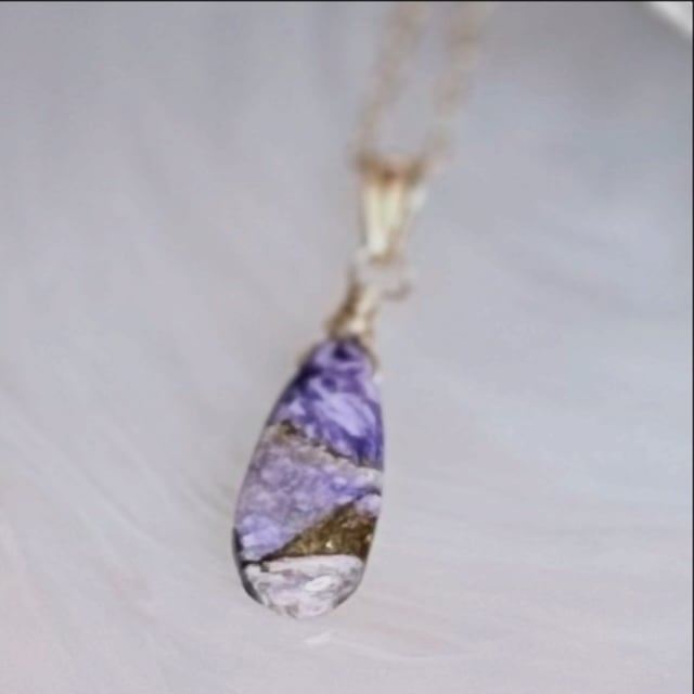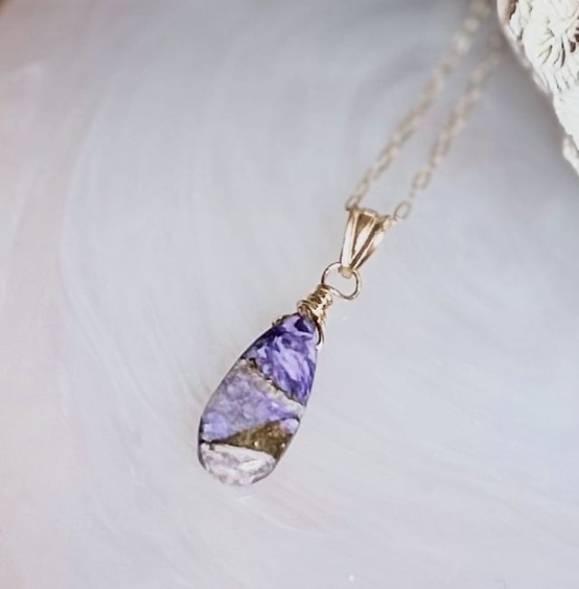神秘の紫と温かな金色が織りなすチャロアイト×銅のブレンド天然石を、ペアシェイプ(涙滴)型にカットしたペンダントトップです。